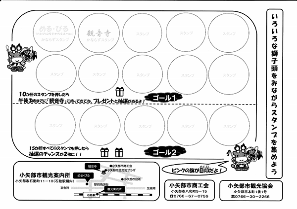令和3年度5月22日(土)10:00-15:00まで実施の小矢部市獅子舞スタンプウォークラリー(これは獅子頭が飾ってあります獅子宿や観音寺はじめめるびる、愛宕神社、福町神明宮をめぐるスタンプウォークラリー)の台紙ができましたのでお知らせします。15ヶ所のポイントが 10カ所巡ると1回抽選でき15ヶ所めぐると2回抽選できる仕組みで当選すると素敵な賞品が当たりますので沢山の方のご参加お待ちしております。台紙はスタート場所の観音寺、めるびる2階、石動駅観光案内所に置いてあります。